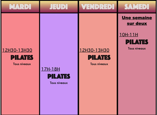 Cours de Pilates tous niveaux d'une heure. Pensez à apporter votre TAPIS.